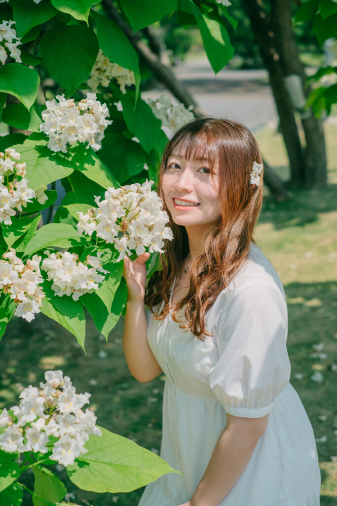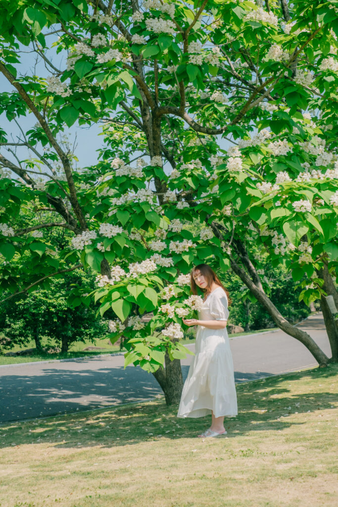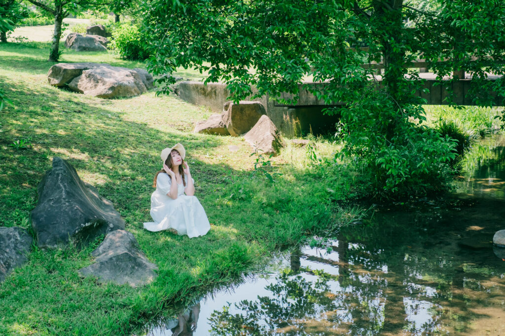 熊本市動植物園の植物園エリアは、初夏の自然光と緑が美しく、ポートレート撮影に最適なスポットです。白ワンピースや麦わら帽子といった爽やかなコーディネートと相性抜群で、季節感あふれる写真を残すことができます。