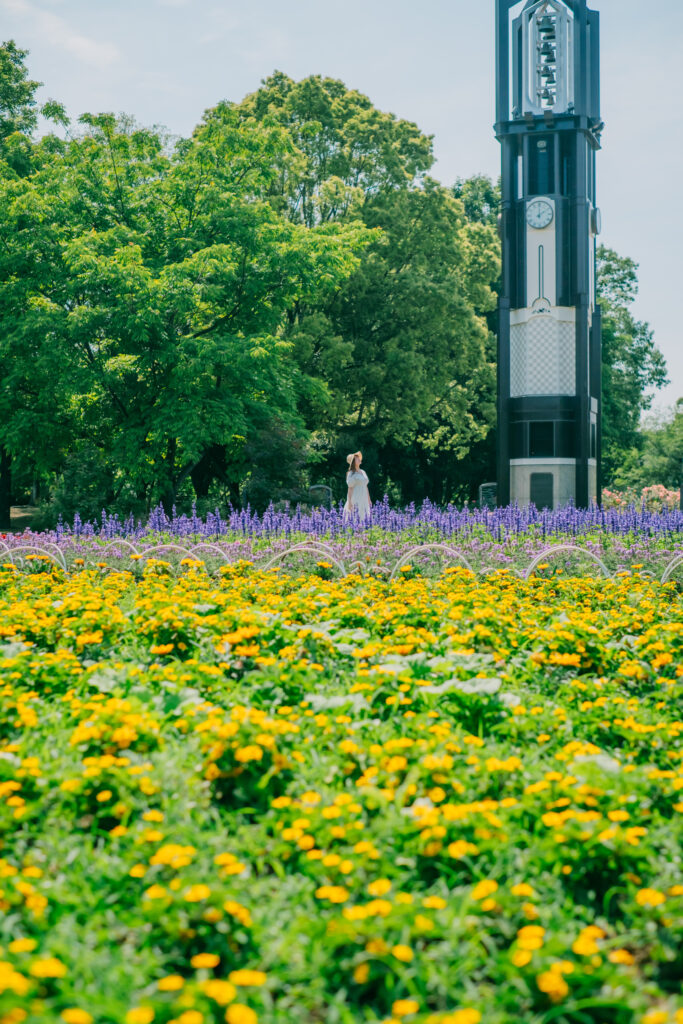特に初夏は新緑が美しく、花壇には色とりどりの花が咲いています。木漏れ日の小道や芝生広場など、背景に困らない撮影ロケーションが豊富に揃っています。