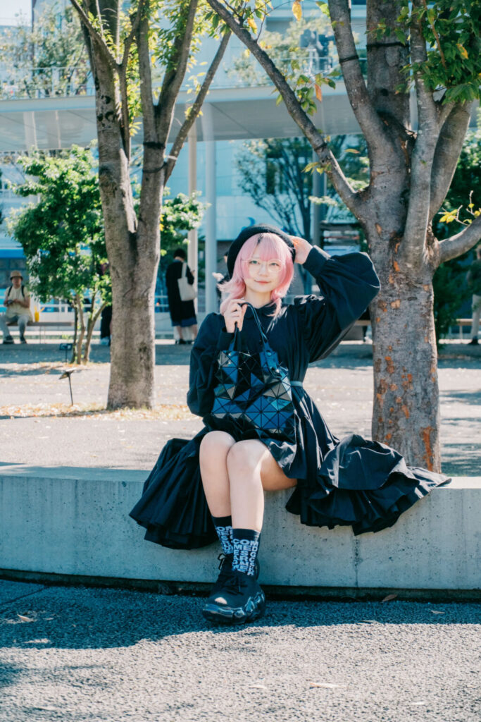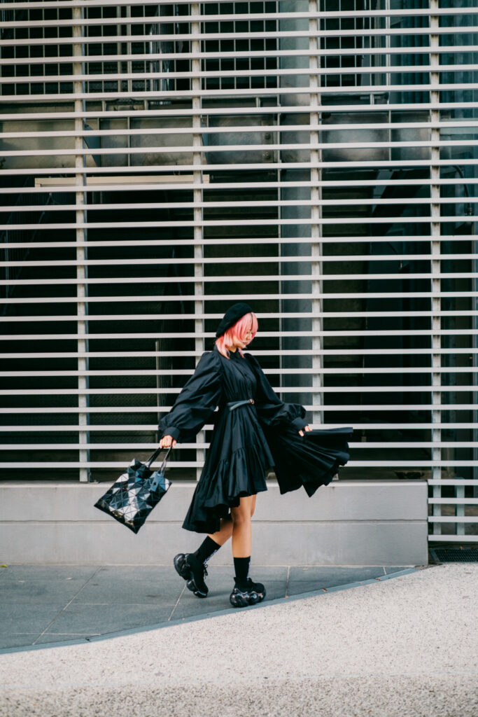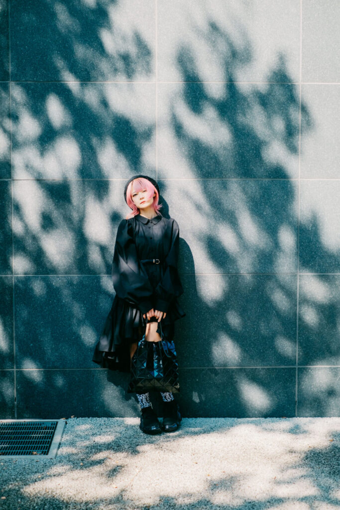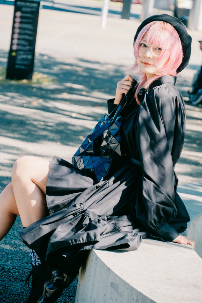 熊本駅周辺は、そうした「偶然」を静かに受け止めてくれる街だ。再開発によって整えられた都市の輪郭と、人の生活がにじむ余白。そのあいだを歩きながら、今回は黒を基調とした装いを一つの軸に、写真作品としてのスナップを重ねていった。