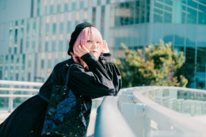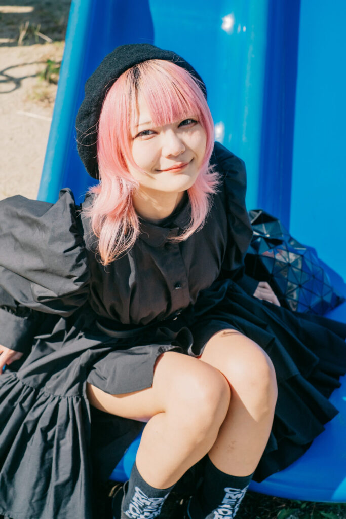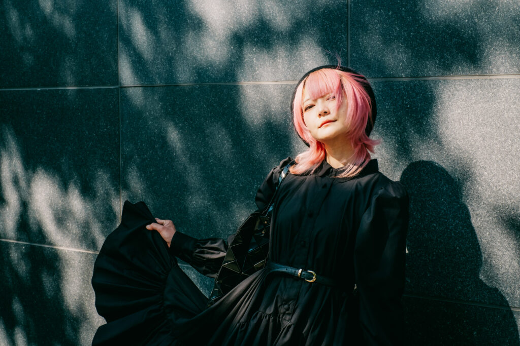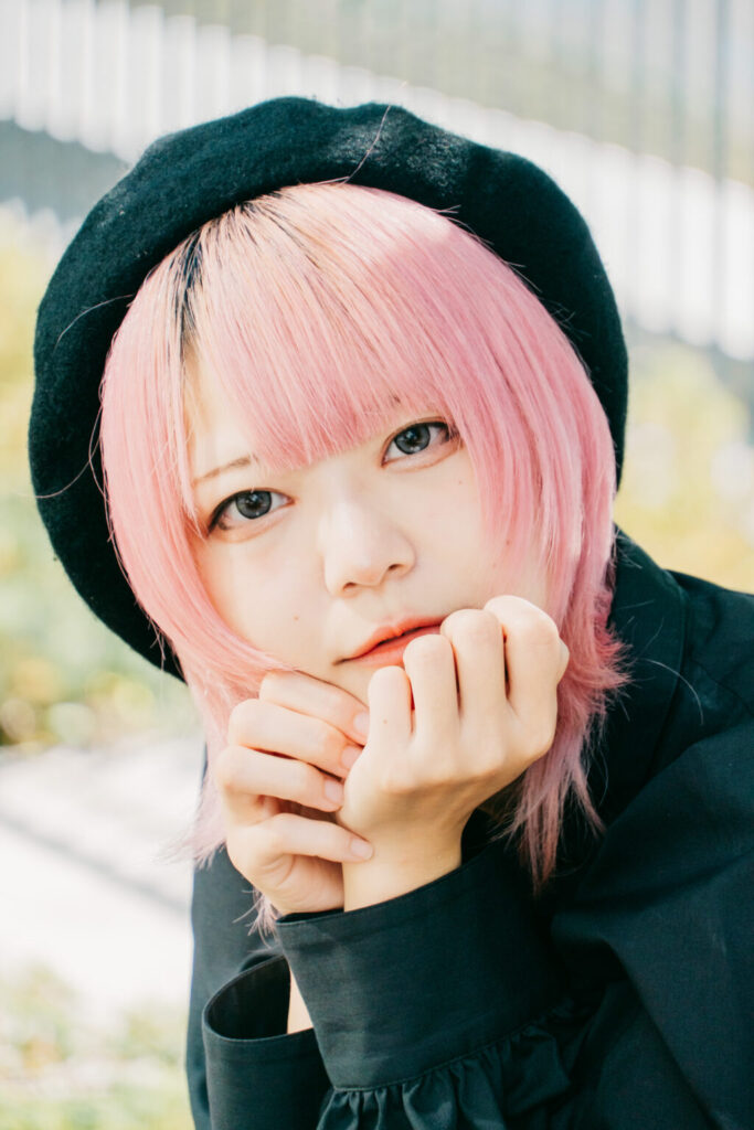 ピンクがかった髪色は、強い色でありながら、決して主張しすぎない。それは、自然光の中で初めて完成する色だ。逆光で輪郭だけが浮かび上がる瞬間、写真は説明を手放し、感覚だけを残す。