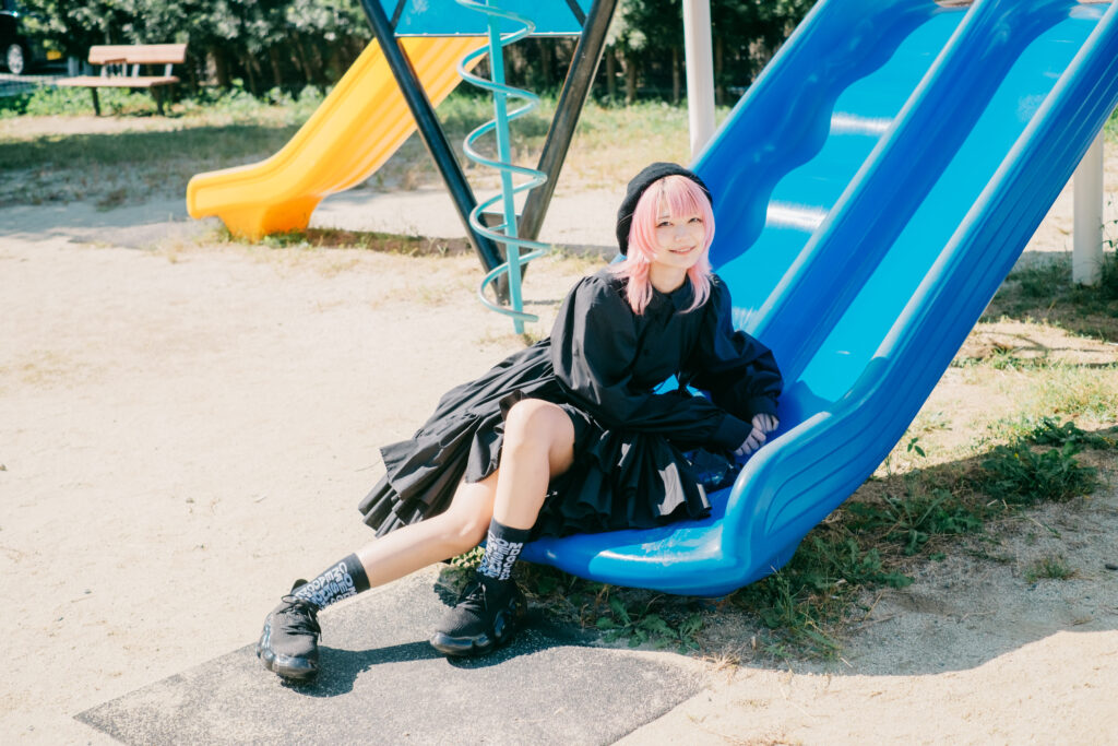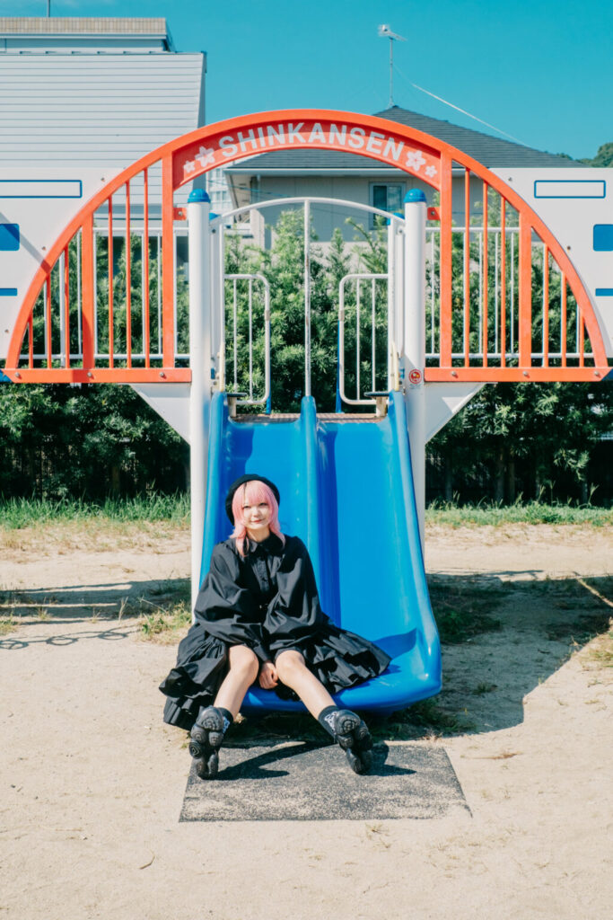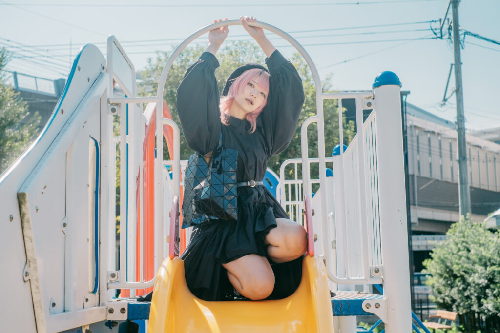 滑り台に腰掛けた一枚では、身体の緊張が少しほどけ、影もまた柔らかくなる。熊本駅という交通の要衝から、ほんの数分歩いただけで、これほど空気が変わる。その事実自体が、この街の持つ奥行きを物語っている。